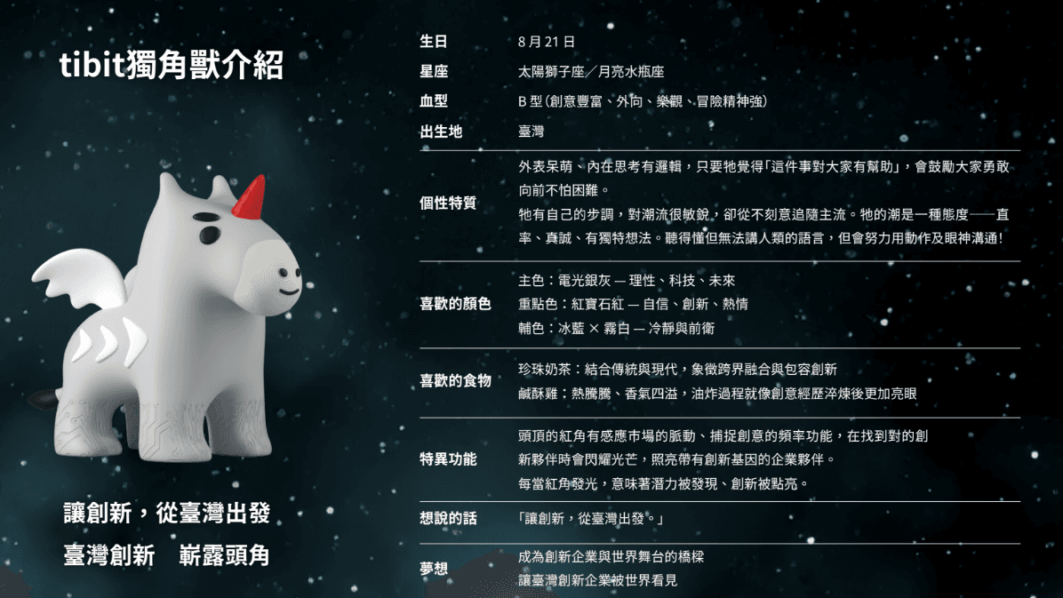 tibit的設計理念,是將「臺灣的創新能量」具象化為一個蓄勢待發的能量生命體,傳達臺灣創新是一種跨領域的混合能力,也相信臺灣的未來值得奔向全世界。tibit的設計細節是創新板精神的語言:紅寶石獨角的發光,象徵創新的火花被發現也代表臺灣創新板在關鍵時刻照亮潛力企業。翅膀則代表加速度與國際移動力,讓臺灣創新成為全球語言。其身上的科技紋理,體現臺灣在半導體及AI上的強大基礎。tibit的存在,就是陪伴創新者的一束光。